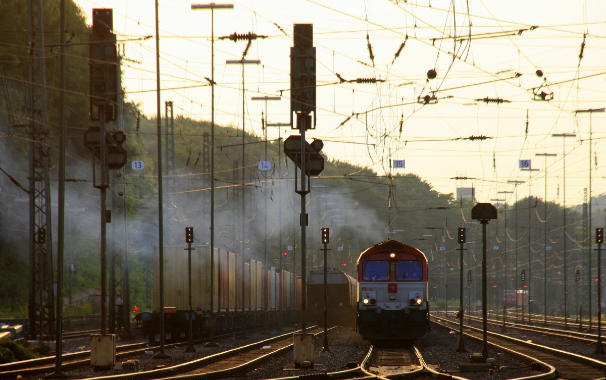 Die Class 66 PB12 "Marleen" von Crossrail fährt mit viel Qualm mit einem langen Ewals-Cargo-Care Containerzug aus Novara(I) nach Genk-Zuid-Haven(B) bei der Ausfahrt aus Aachen-West und fährt in Richtung Montzen/Belgien in der schönen Abendstimmung am 16.7.2013.