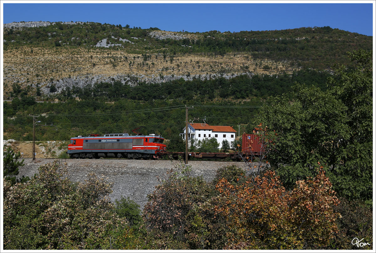Am Friedhof in Loka Podpec vorbei, schiebt 541 103 einem Güterzug über die Koperrampe nach.