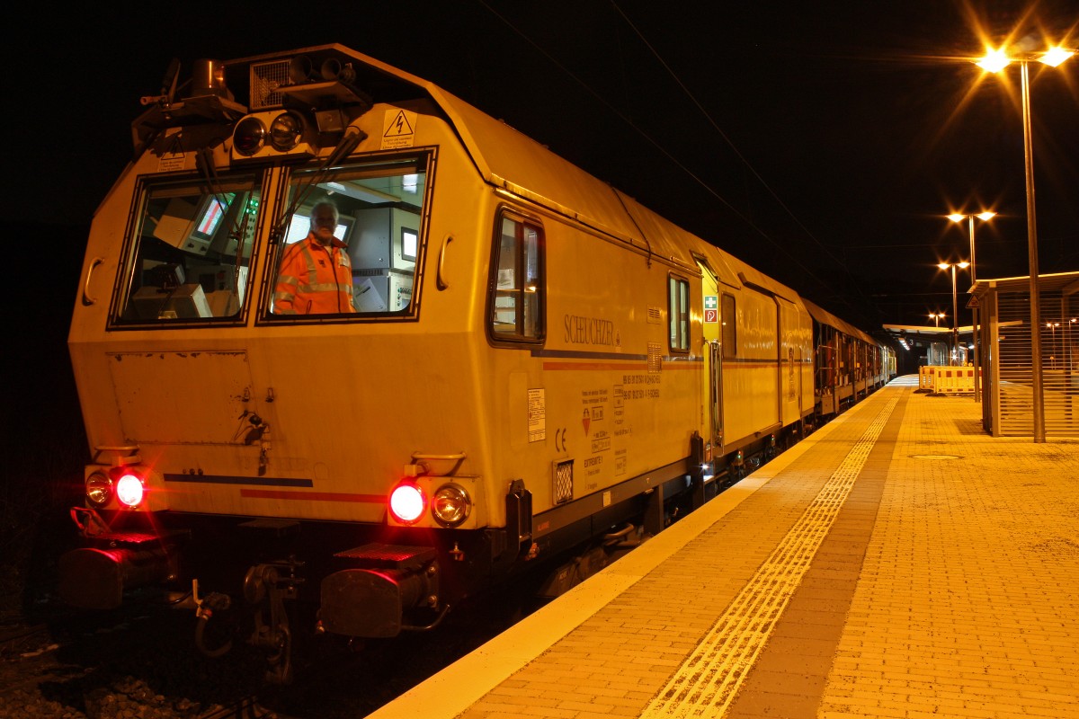 Scheuchzer Schienenschleifzug 99 85 91 27 501-6 CH-SCHEU/99 87 91 27 501-4 F-SCHEU wartet am Abend des 16.3.13 auf Gleis 3 darauf das die letzte S-Bahn den Bahnhof Essen-Kettwig erreicht.Danach wurde der Takt der S-Bahn geändert damit der Zug die Strecke von Kettwig bis Hösel problemlos Schleifen konnte.