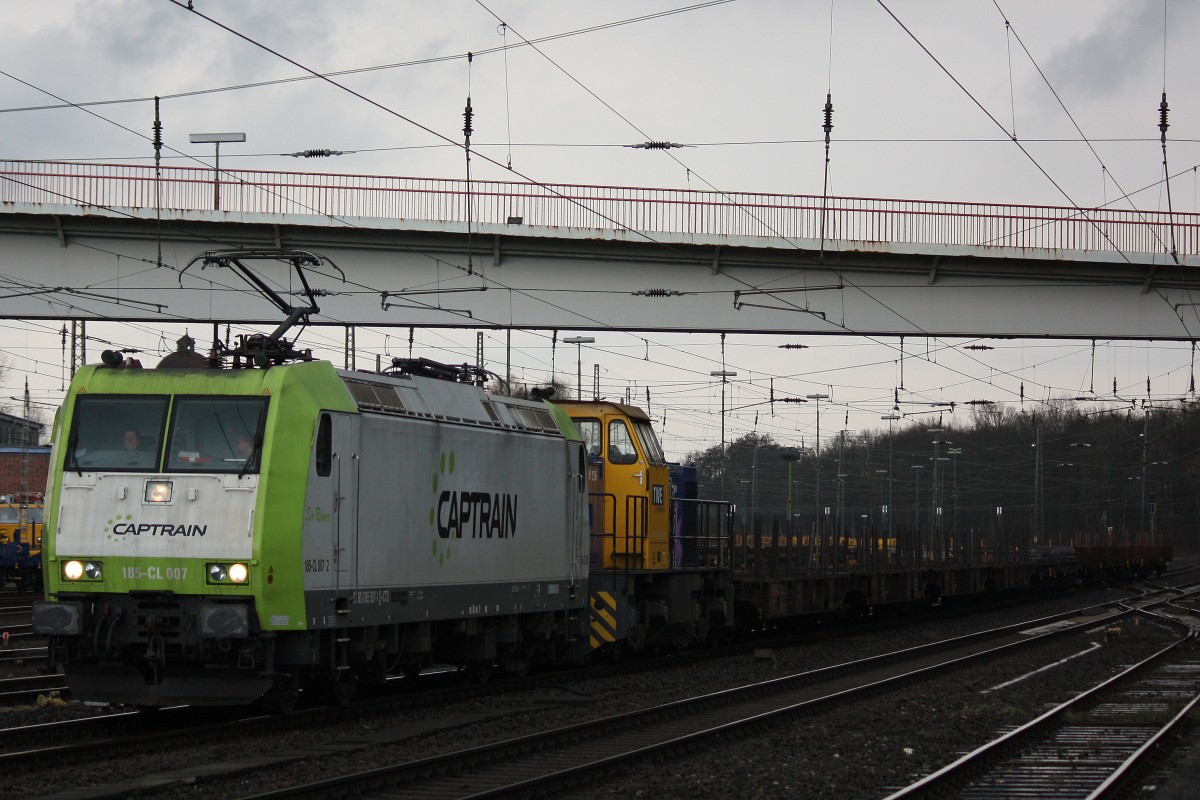 Captrain 185-CL 007 "Sir Rainer" mit TWE V156 und leeren Stahlzug am 20.3.13 in Duisburg-Entenfang.