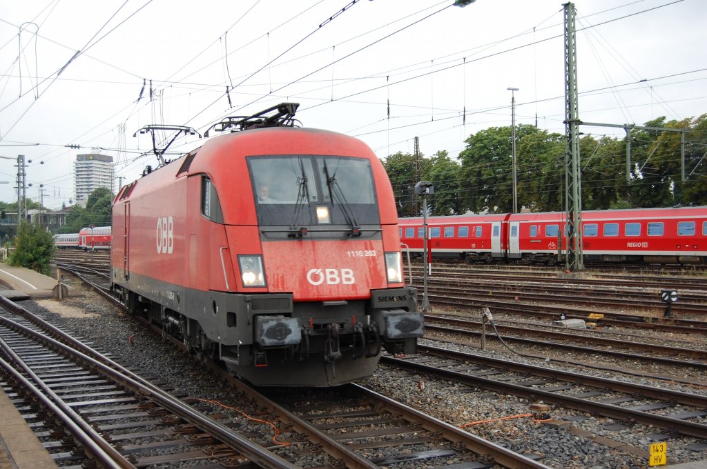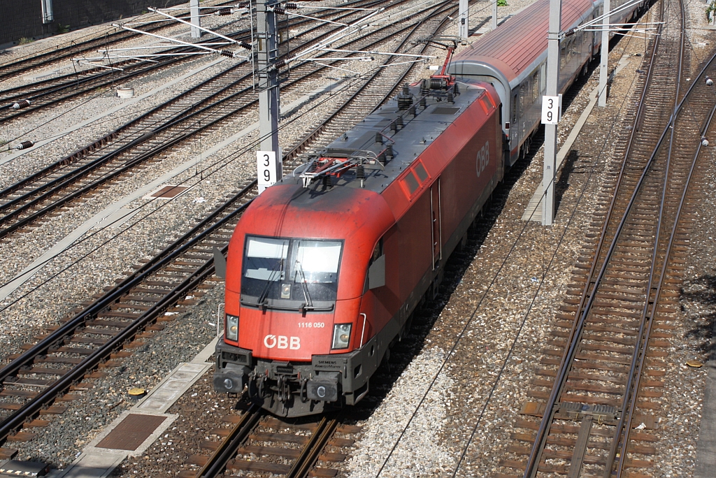 1116 050 fährt am 07.August 2013 mit 23 Minuten Verspätung und dem EC 159 "Croatia" nach Graz aus dem Bf. Wien Meidling.