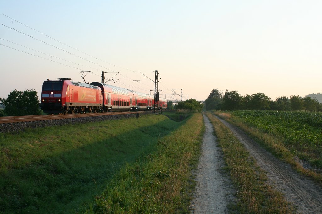 146 113-6 mit dem RE 5333 von Offenburg nach Basel SBB am frühen Morgen des 08.07.13 bei Hügelheim.
