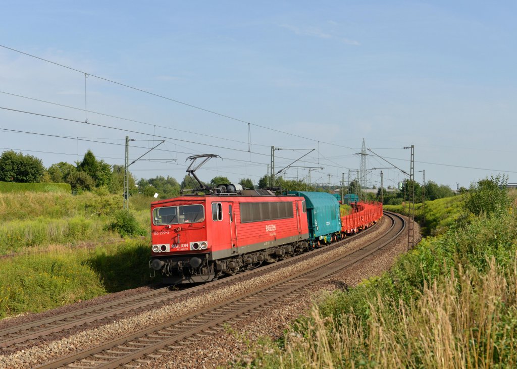 155 222 mit neuen Güterwagen am 07.08.2013 bei Plattling.