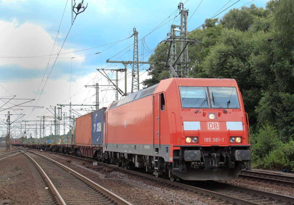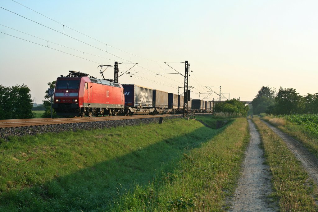 185 132-8 mit einem KLV-Zug in die Schweiz am Morgen des 08.07.13 auf Höhe des Müllheimer (Müllheim/Baden) Stadtteils Hügelheim.