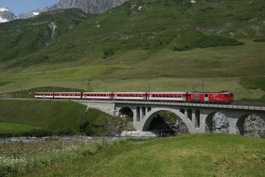 Das letzte Bild aus Hospental zeigt schliesslich den Deh 4/4 II 96, welcher mit einem Regionalzug nach Göschenen die Furkareuss überquert (13.07.2013).