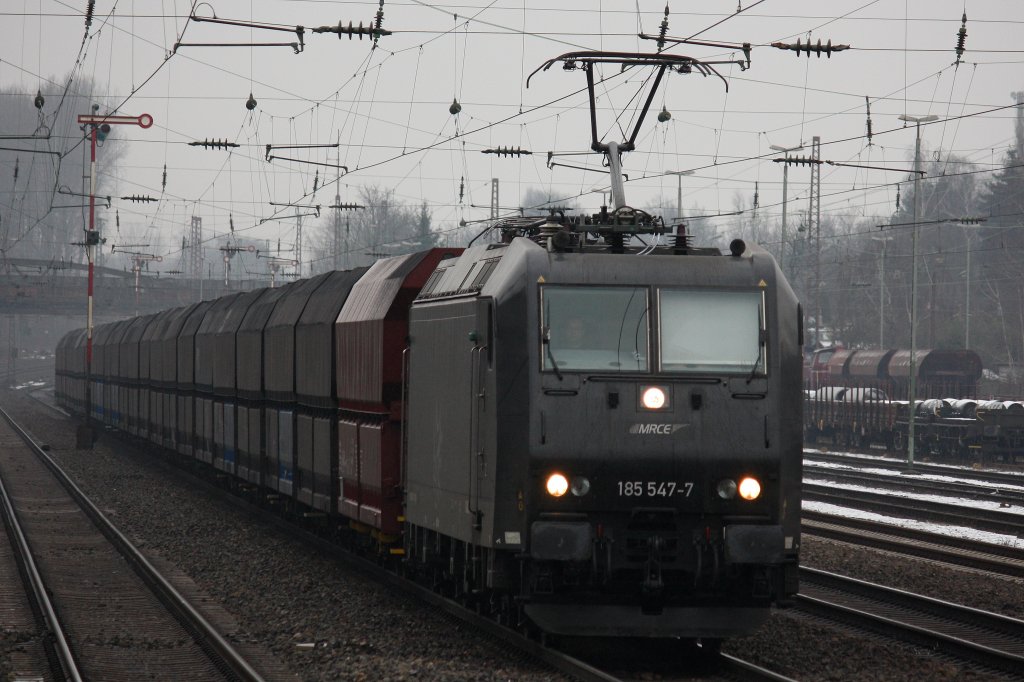 MRCE 185 547 am 24.2.13 mit einem Kohlezug in Düsseldorf-Rath.