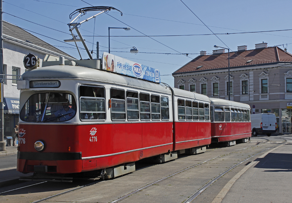 Wiener Straßenbahn: Linie 26: Kagran-Strebersdorf. E1+c4: 4776+1341 kurz vor der Endstation im äußersten Norden von Wien. 1.8.2013