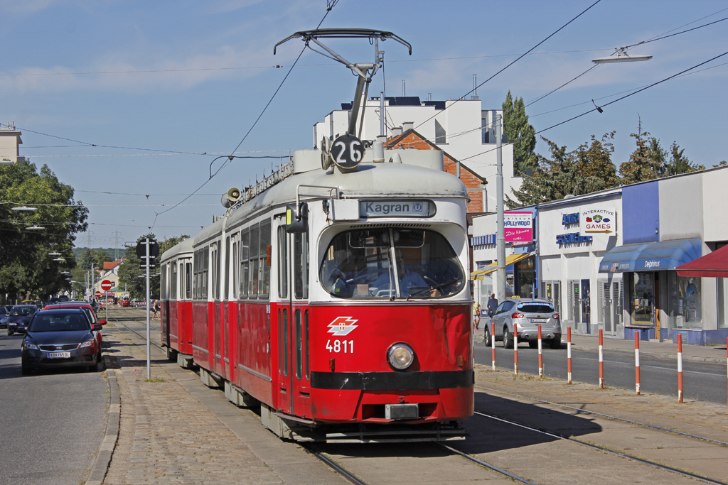 Wiener Straßenbahn: Linie 26 (Strebersdorf-Kagran) E1+c4 4811(leicht beschädigt)+1xxx an der Station Rußberggasse. Ein heißer 1.8.2013.