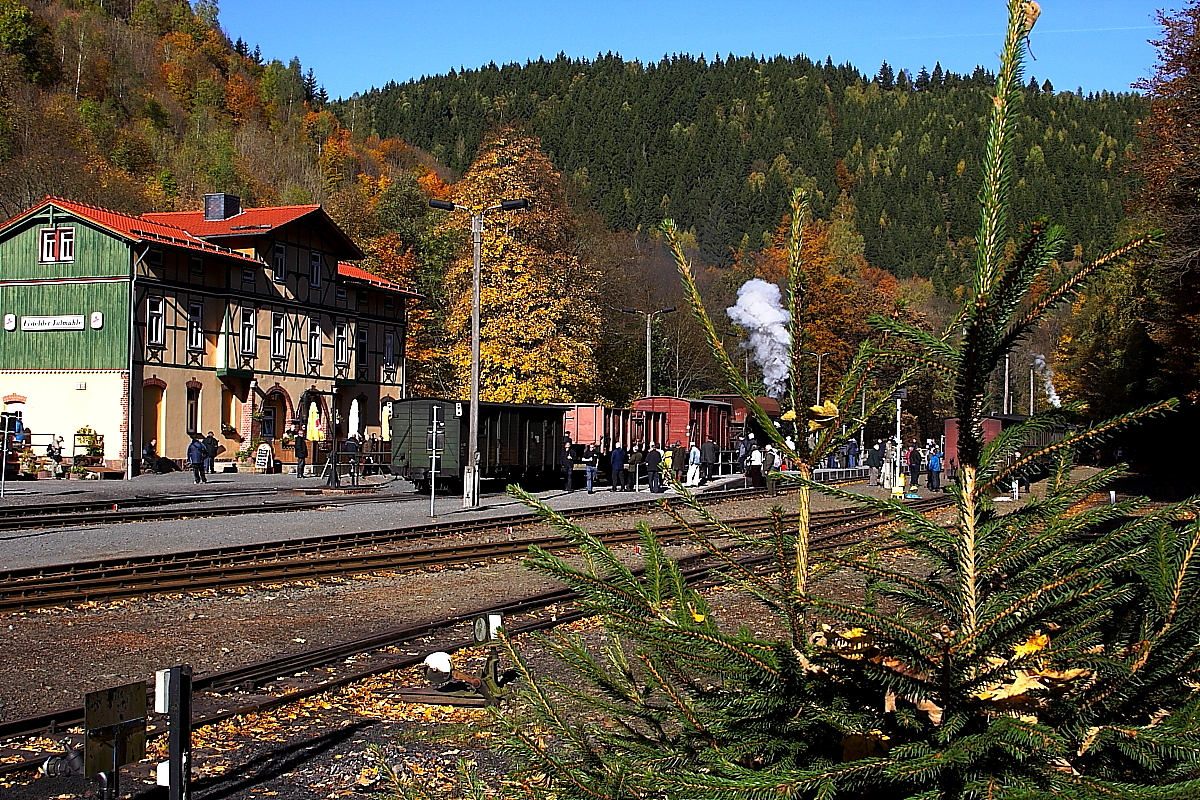 Buntes Treiben am 19.10.2013 im Bahnhof "Eisfelder Talmühle". Links auf Gleis 1 steht der Foto-Güterzug der HSB, rechts ist der Sonderzug der IG HSB zu sehen, beide heute unterwegs im Rahmen einer dreitägigen Sonderzugveranstaltung der IG HSB unter dem Motto "Schmalspur-Romantik im Oktober". In Kürze wird es eine Doppelausfahrt des Güterzuges mit einem Planzug geben, danach fahren beide Züge wieder zurück nach Wernigerode.