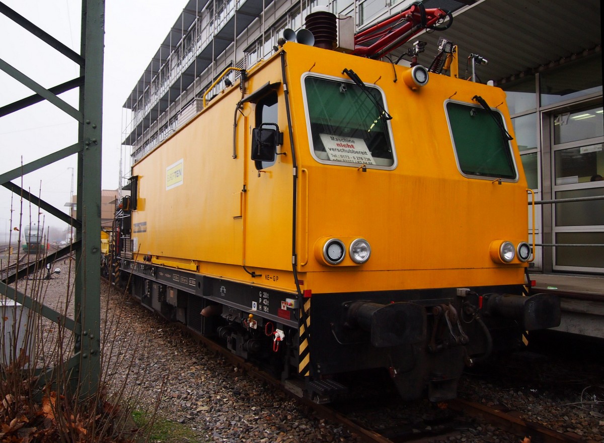 Motorturmwagen Plasser und Theurer MTW 10.272 in Regensburg am 12.12.2013. Ein Bild von dem Ende der Plattform gemacht