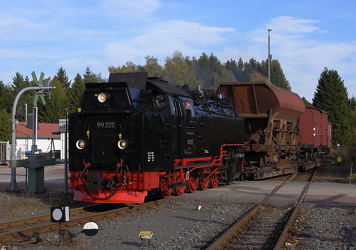 99 222 mit dem Foto-Güterzug der IG HSB am 19.10.2013, auf der Rückfahrt nach Wernigerode, bei der Einfahrt in den Bahnhof Benneckenstein.