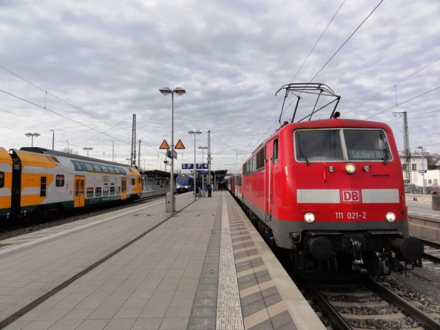 Der 15.12.2013 war der erste Betriebstag des Meridian im E-Netz Rosenheim. Jedoch verkehren bislang hauptsächlich Ersatzzüge, weil die heutige Eisenbahnindustrie erneut den Liefertermin für Neufahrzeuge nicht hat einhalten können. Der aus 111 021 und Bn-Wagen gebildete Zug lief genauso unter der Zuggattung ,,M'' wie der tatsächlich schon ausgelieferte FLIRT in der Mitte. Auch der abgestellte ODEG-KISS links ist ein Meridian-Ersatzzug.