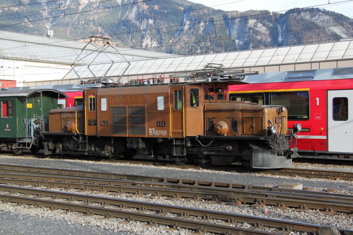 Am 12.12.2013 wurde der Bernina-Express von den beiden ABe 4/4 III 55 "Diavolezza" und 56 "Corviglia" (beide mit REPOWER-Werbung) über den Berninapass gezogen. Hier in Ospizio Bernina.