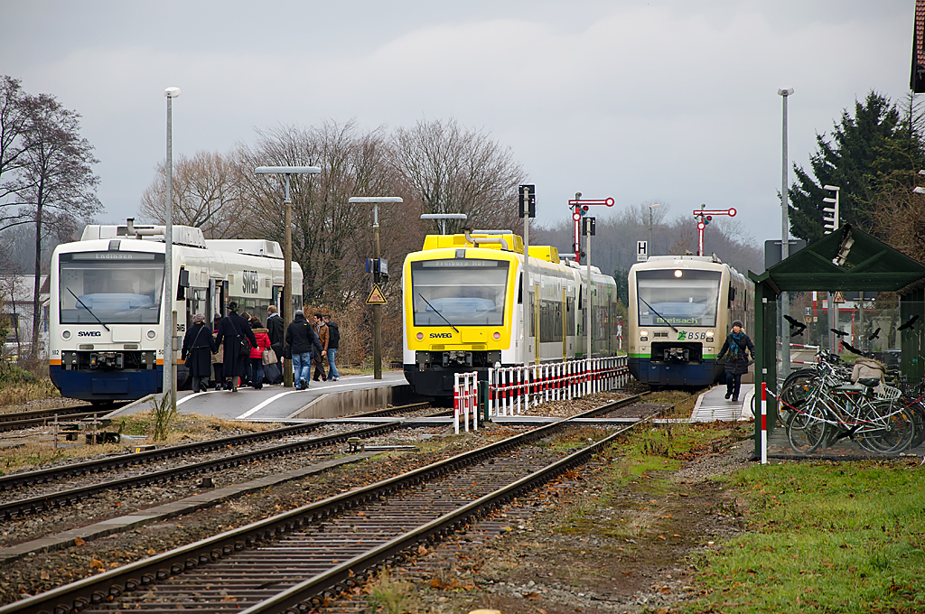 Rushhour in Gottenheim Bf. an der KBS 729: VT 016 ( 95 80 0650 043-2 D-BSB ) begegnet auf der Fahrt von Freiburg Hbf nach Breisach dem in Gegenrichtung verkehrenden VT 019 ( 95 80 0650 046-5 D-BSB ).Der auf Gleis 3 wartende VT 502 ( 95 80 0650 596-9 D-SWEG ) der SWEG verbindet die KBS 729 ab Gottenheim mit der Kaiserstuhlbahn in Richtung Endingen a.K. Die Aufnahme entstand am 14.12.2013 vom Park&Ride-Parkplatz des Bahnhof Gottenheim