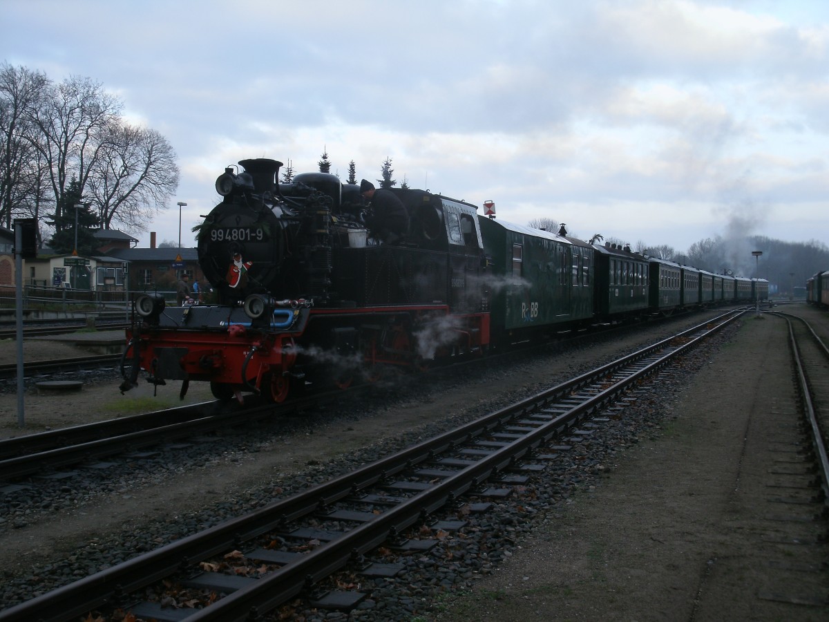 Ohne Schnee und trüben Wetter fuhr in diesem Jahr die Weihnachtssonderfahrt beim Rasenden Roland.Am 14.Dezember 2013 stand 99 4801 mit dem Sonderzug in Putbus.Hier mußte die Lok nur noch an das andere Zug wechseln.