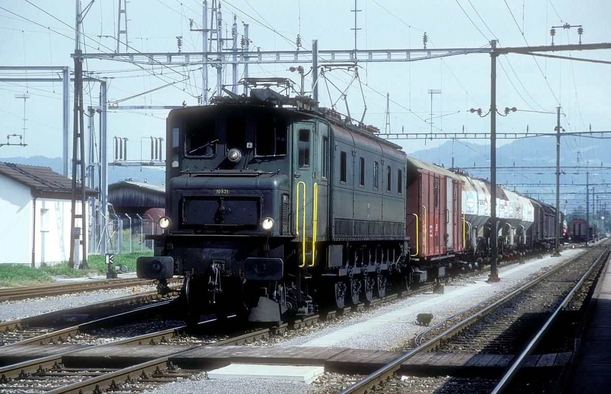 Elektrolok V 46058 wartet mit einem Leergüterzug auf dem Ausweichgleis in Richtung