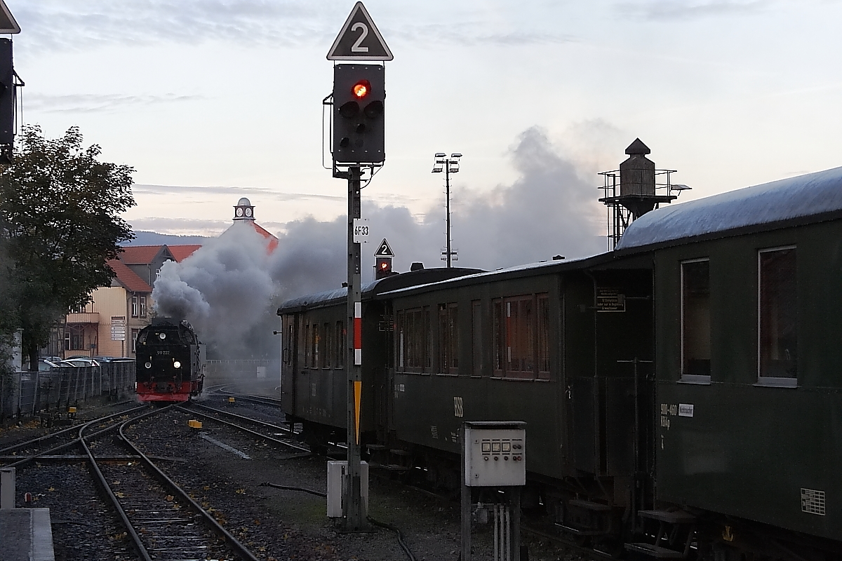 99 222 am Morgen des 19.10.2013 bei der Einfahrt in den Bahnhof Wernigerode. Sie wird hier in wenigen Augenblicken den Foto-Güterzug der HSB übernehmen, welcher einen Sonderzug der IG HSB nach Eisfelder Talmühle als Fotokulisse begleiten wird. Rechts sind drei Wagen des Traditionszuges der HSB zu sehen.