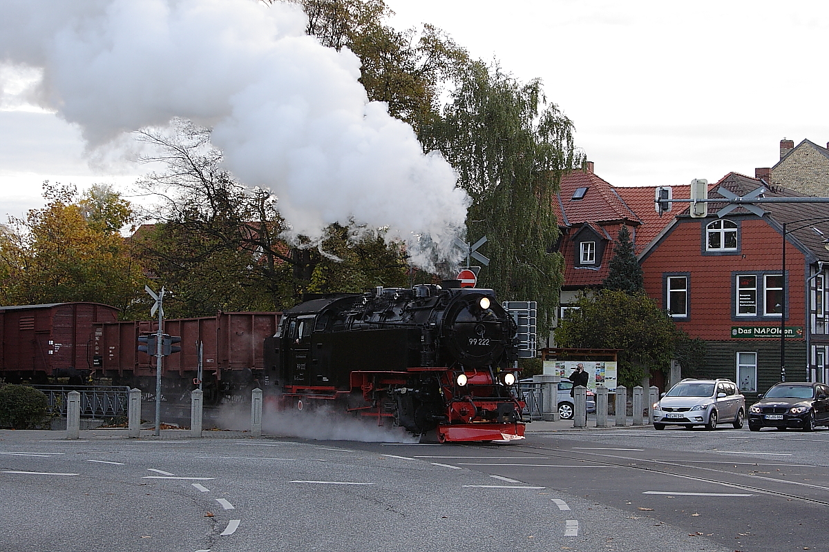 99 222 mit dem Foto-Güterzug der HSB am Morgen des 19.10.2013 beim Überqueren der Westerntor-Straßenkreuzung in Wernigerode. Dieser Zug wurde an jenem Tag ausschließlich für die Fahrgäste eines Sonderzuges der IG HSB eingesetzt. Wenige Minuten später folgte dann unser Sonderzug und hielt kurz hinter der Straßenkreuzung an, um die Fotografen wieder aufzunehmen. Danach ging es weiter nach Hasserode, wo wir den Güterzug wiedersahen. Dort erfolgte dann auch eine Scheinanfahrt!