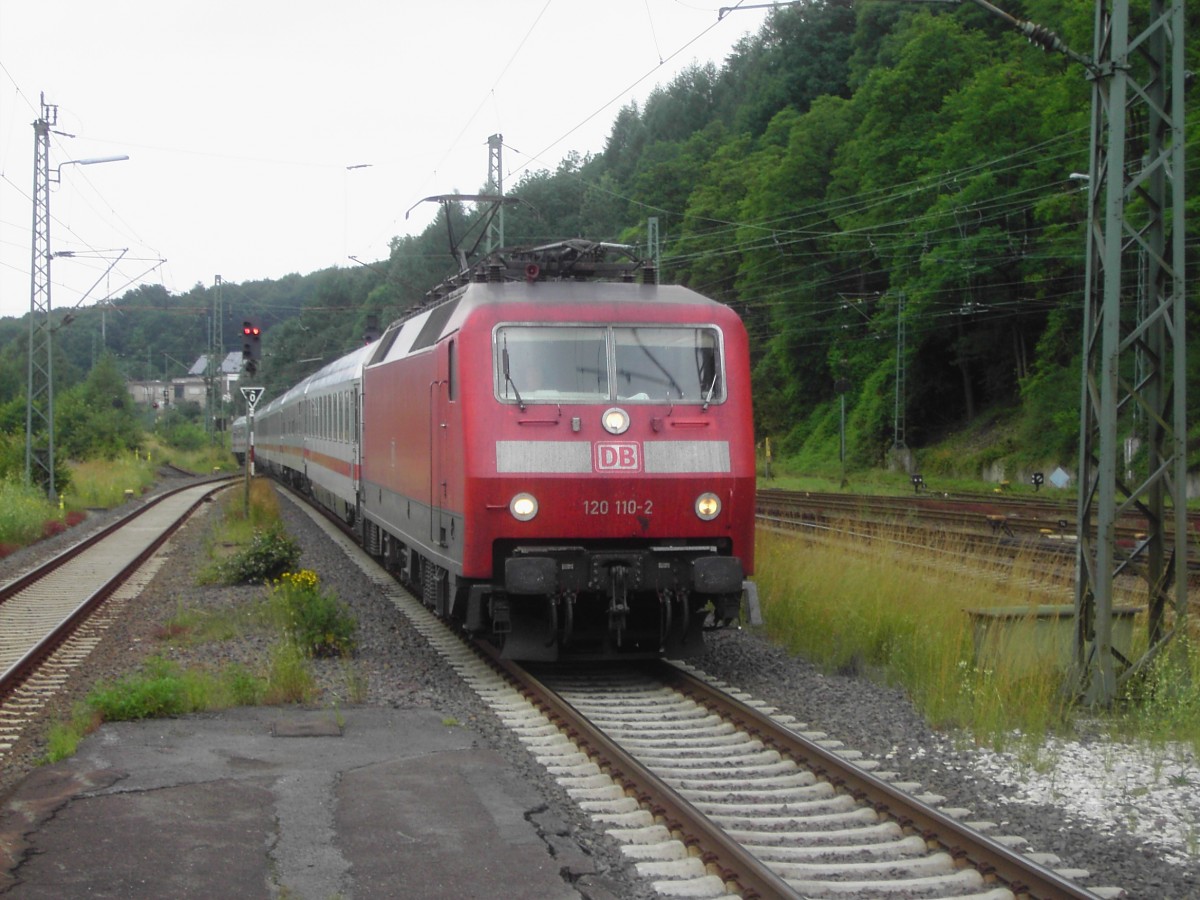 Im Juni 1987 fährt 110 120-3 die Steigung von Erkrath nach Hochdahl hinauf. Gleichzeitig auch ein (leicht verspäteter) Gruß zum 175. Geburtstag: Am 20.12.1838 eröffnete die Düsseldorf-Elberfelder Eisenbahn-Gesellschaft die Strecke von Düsseldorf nach Erkrath, 1841 wurde die Verlängerung bis Hochdahl und weiter nach Elberfeld in Betrieb genommen. Vom Bahnhof Erkrath bis Hochdahl hat die Bahn auf ca. 2,5 km 82 Höhenmeter zu überwinden. Wegen der geringen Leistungsfähigkeit der damaligen Lokomotiven wurden die Züge zunächst mittels einer stationären Dampfmaschine in Hochdahl an einem Seil nach oben gezogen. Ziemlich schnell wurde die Dampfmaschine durch eine Umlenkrolle ersetzt und talwärts fahrende Lokomotiven oder Züge unterstützten die bergwärts fahrenden mittels Seil. Erst 1926 wurde dieses System aufgegeben, bis zur Elektrifizierung wurden bis zu drei Dampflokomotiven bei schweren Zügen für die Bergfahrt benötigt.