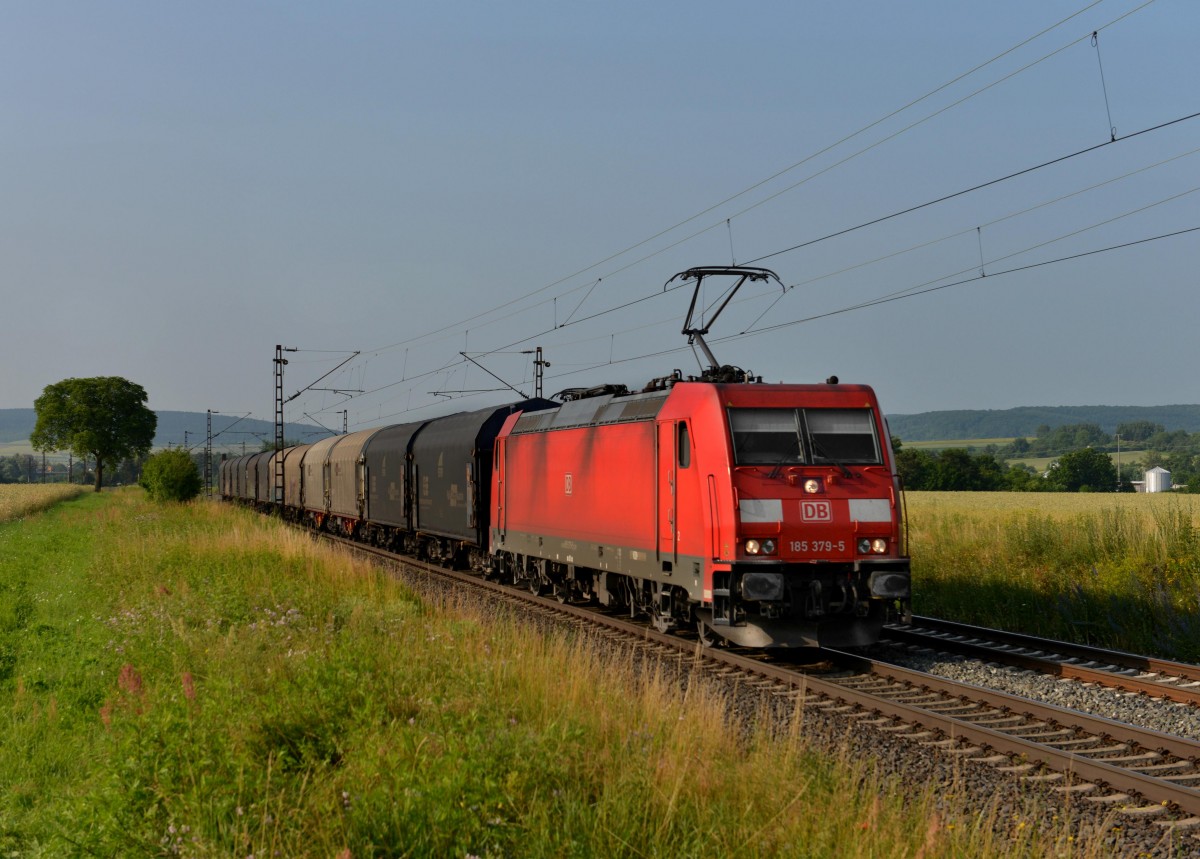 185 379 mit einem Stahlzug am 06.07.2013 bei Himmelstadt.