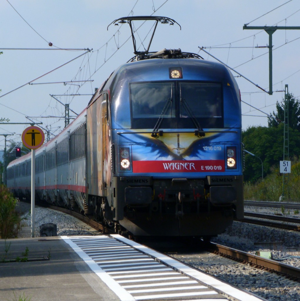 ÖBB 1216 019, werbend für Wagner bzw. Verdi bespannt am 29.8.13 einen Brenner EC. Hier durchfährt der Zug den Bahnhof Ostermünchen und wird in wenigen Minuten im Bahnhof Rosenheim das nächste mal zum Stehen kommen.