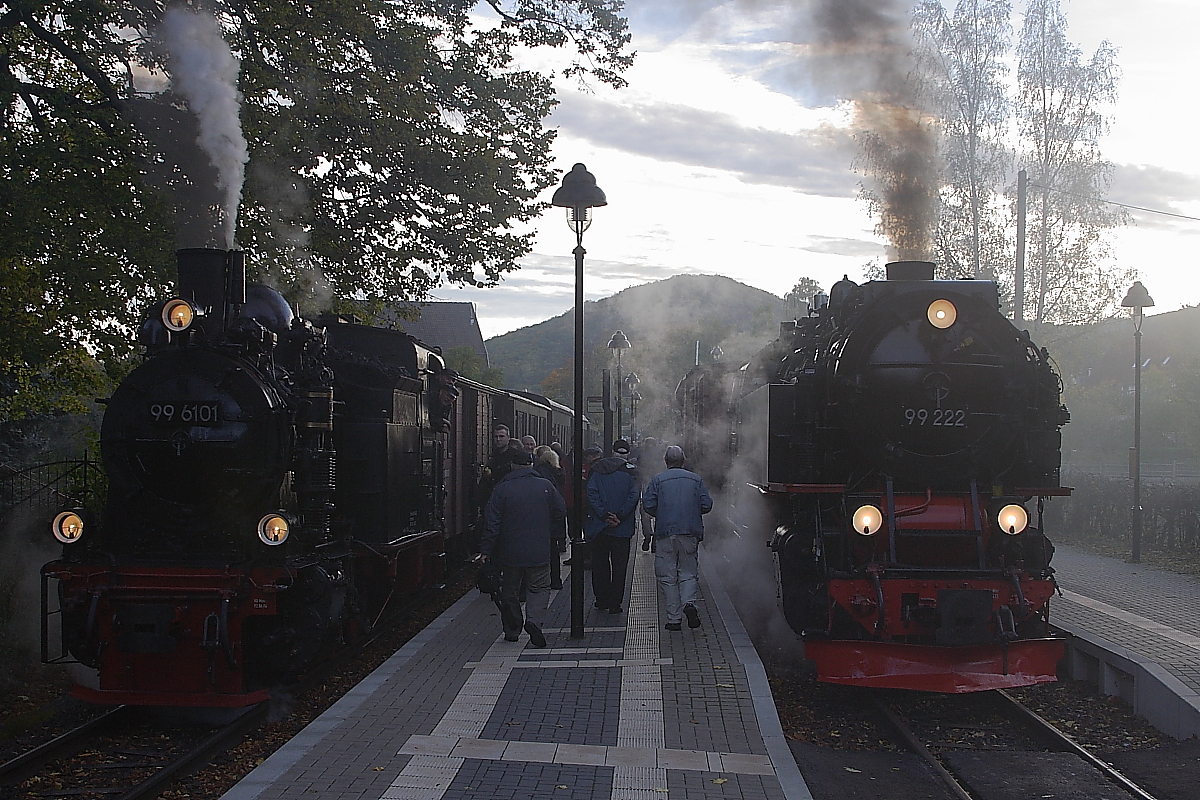 Nach einem kurzen Zwischenstopp im Haltepunkt  Steinerne Renne , muß 99 7235 am 19.10.2013 ihren Planzug P8931 zum Brocken an der starken Steigung wieder in Fahrt bringen. Dieses optische und akustische Highlight will sich, wie man hier sieht, natürlich kein Fotograf entgehen lassen! ;-) Rechts wartet indessen 99 6101 mit einem Sonderzug der IG HSB auf die Weiterfahrt.