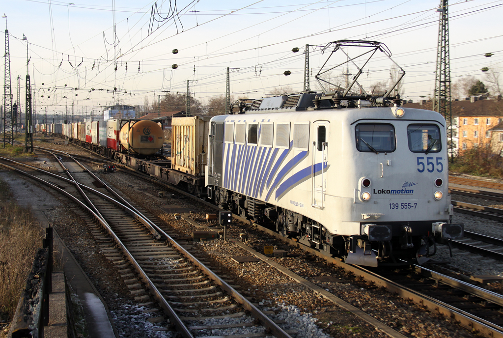 Die Lokomotion 139 555 zieht einen KLV aus Leipzig durch Rosenheim weiter Richtung Kufstein am 04.12.2013