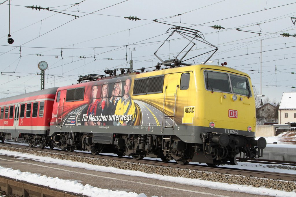 111 024 schiebt den RE aus dem Bf. Traunstein Richtung München, aufgenommen am 11.02.2013