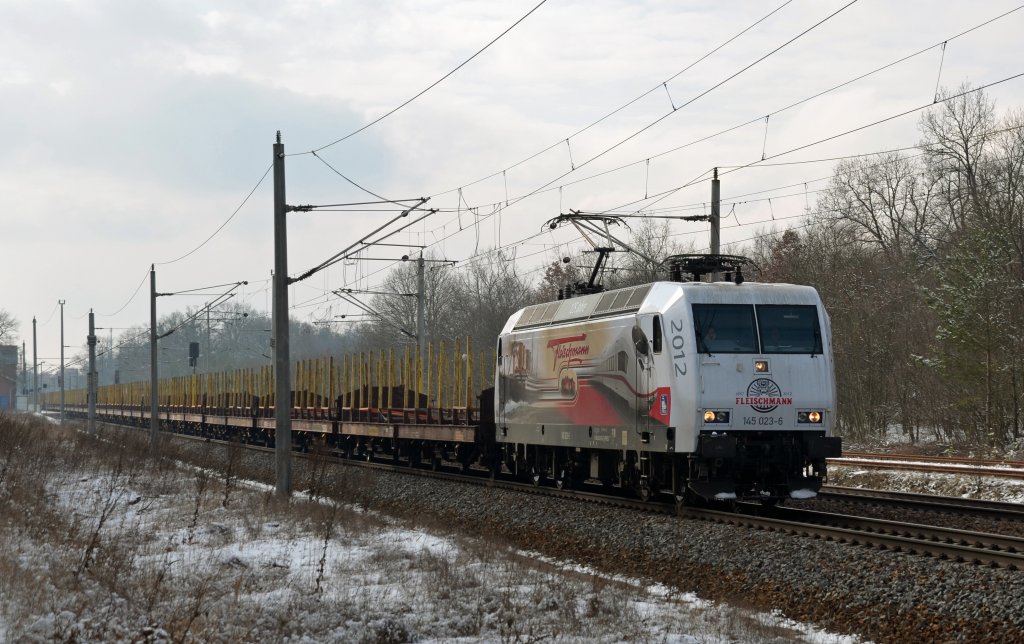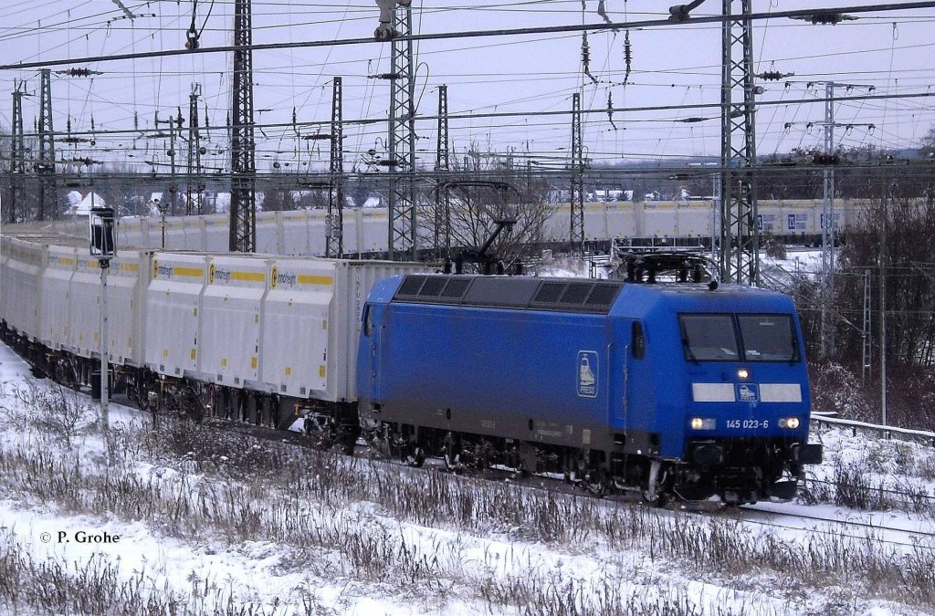 Press 145 023-6 vor Ganzzug Innofreight von Augsburg nach Niedergörne, fotografiert in Halle Saale am 30.11.2010