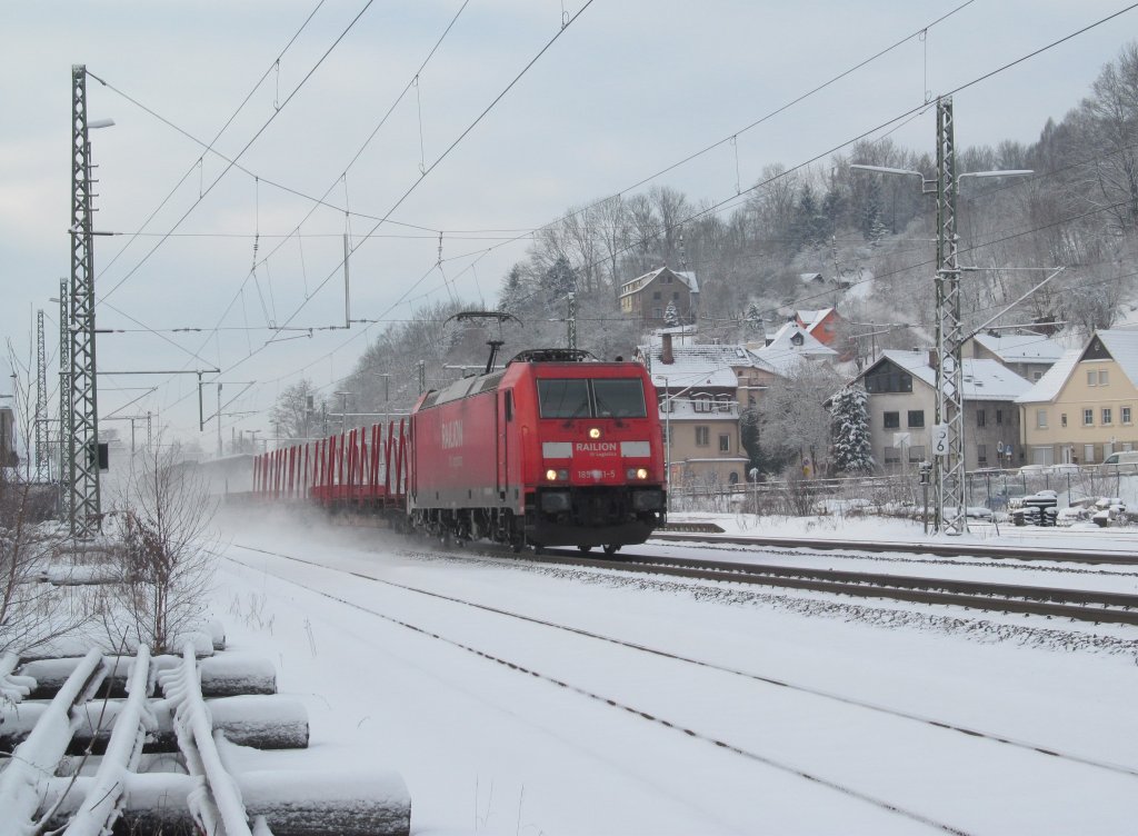 Am 11. Februar 2013 brachte sie einen Autoteilezug von Ingolstadt nach Stuttgart. Um 12:09 Uhr passierte die Lok unsere Fotostelle bei Breitenfurt im herrlich verschneiten Altmühltal.