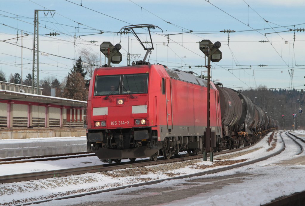 185 314 mit einem Güterzug bei der Durchfahrt im Bf. Traunstein am 11.02.2013