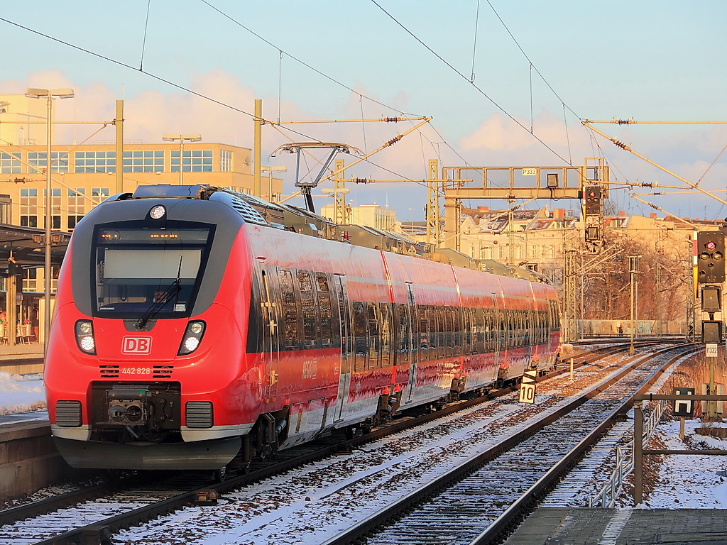 Berlin Charlottenburg am 09. Februar 2013, Einfahrt von 442 828 mit 442 328 als RE 7 (RE 18723) zur Weiterfahrt nach Bad Belzig.