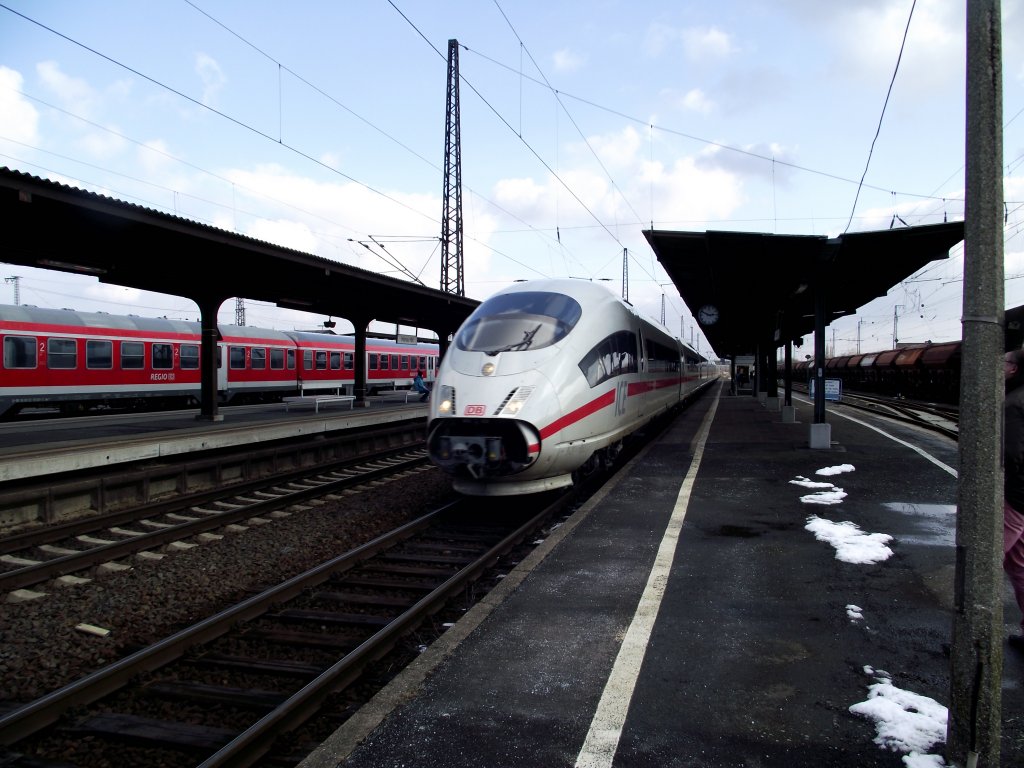 Ein ICE 3 (BR 403) mit offener Schnauze am 09.02.13 in Hanau Hbf