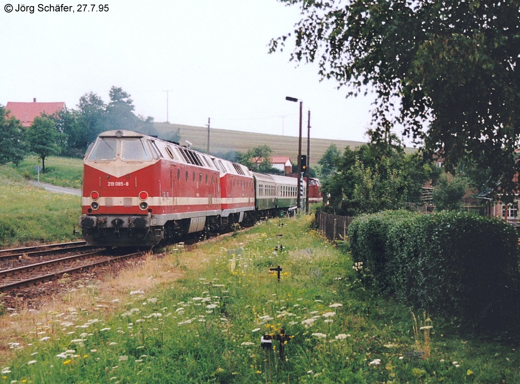 219 117 verlässt am 18.5.98 mit ihrer RB nach Lobenstein den Bahnhof Moßbach.