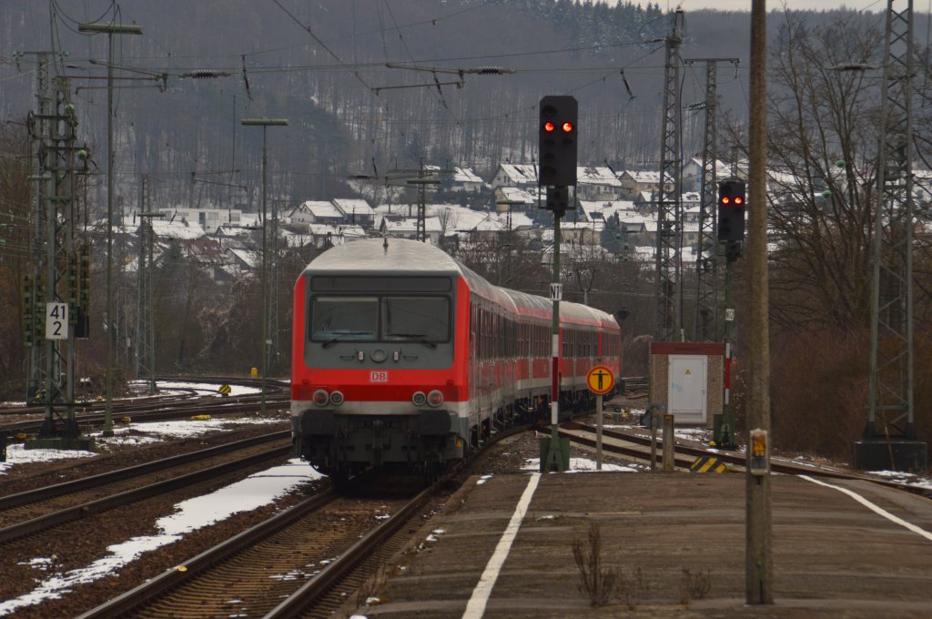 Nachschuß auf den Wittenbergersteuerwagen einer RB, der nach Stuttgart den Bahnhof Neckarelz verlässt, gezogen von der 146 225 und besteht aus N-Wageb am Rosenmontag den 11.2.2013 gegen 11:00 Uhr.
