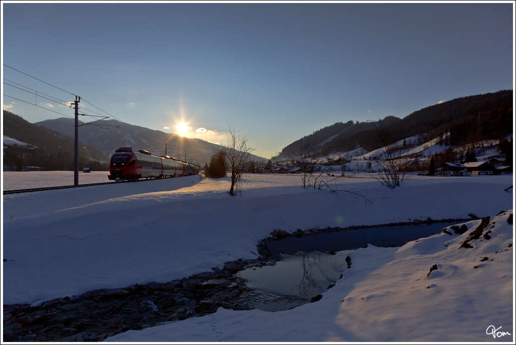 Während die Sonne über der Planai untergeht, fahren 4024 102 + 4024 128 als Shuttlezug SR 9321 bei der Alpinen Ski WM 2013 in Schladming , von Schladming nach Haus im Ennstal.