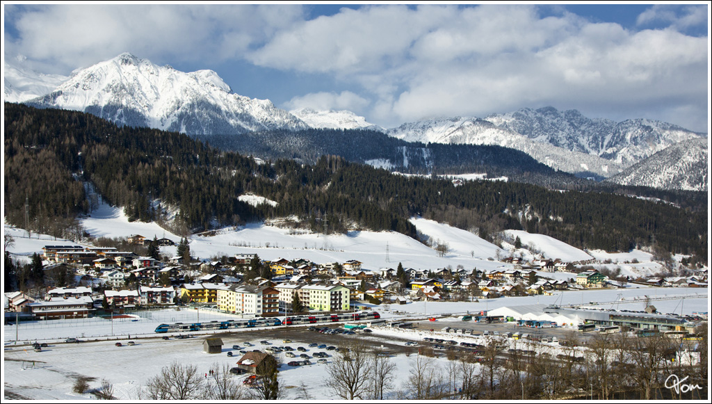 Werbetalent 4024 128 "voestalpine skygate" und 4024 102, fahren mit Shuttlezug SR 9326 bei der Alpinen Ski WM 2013, von Haus im Ennstal nach Schladming. Im Hintergrund sieht man das mächtige Dachsteinmassiv.