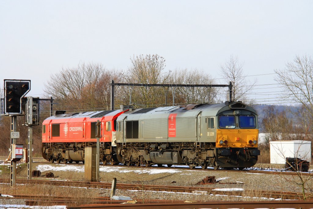 Ein Nachschuss von der Class 66 DE6309 von DLC Railways auf dem Weg von Montzen-Gare(B) nach Aachen-West bei schönem Wintwetter am 10.2.2013.