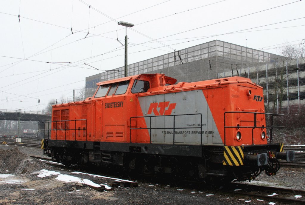 Ein Nachschuss von der V104 "Sally" von der Rurtalbahn rangiert in Aachen-West bei leichten Schneefall am Rosenmontag 11.2.2013.