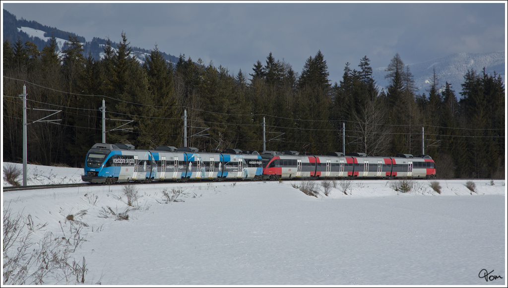 4024 102 und 4024 128 "voestalpine skygate" Talent fahren als Shuttlezug SR 9395 bei der Alpinen Ski WM 2013 in Schladming.