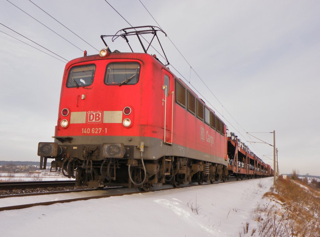 Hier 145 027-9 mit der Wagenlok 362 940-9 und einem Güterzug, bei der Durchfahrt am 6.2.2013 durch Berlin Schönefeld Flughafen, in Richtung Berlin Grünauer Kreuz.