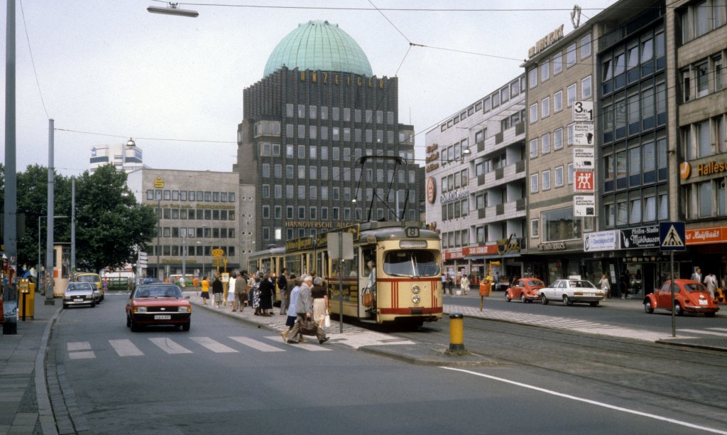 Hannover ÜSTRA SL 8 (T4 505) Kurt-Schumacher-Strasse am 26. Juni 1981. - Im Hintergrund sieht man das Anzeiger Hochhaus, das 1927/28 vom Professor Höger erbaut wurde.