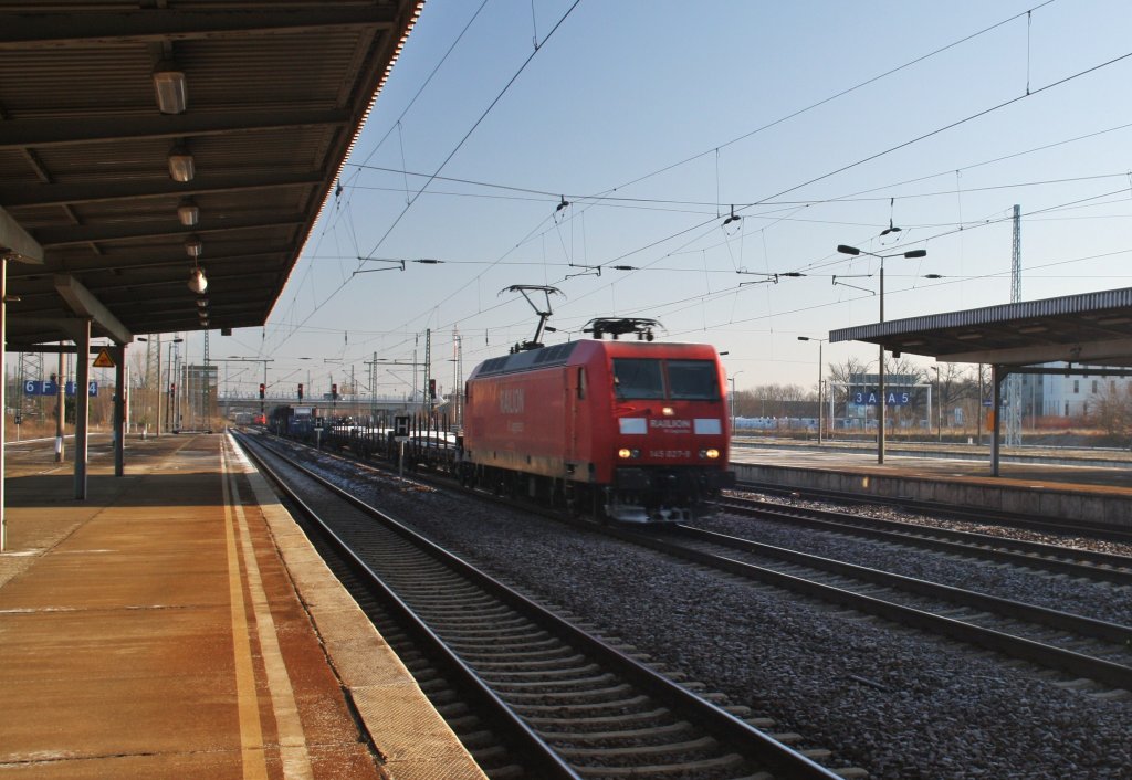 Hier 145 027-9 mit einem Gemischten Gz, bei der Durchfahrt am 6.2.2013 durch Berlin Schönefeld Flughafen, in Richtung Wünsdorf-Waldstadt.