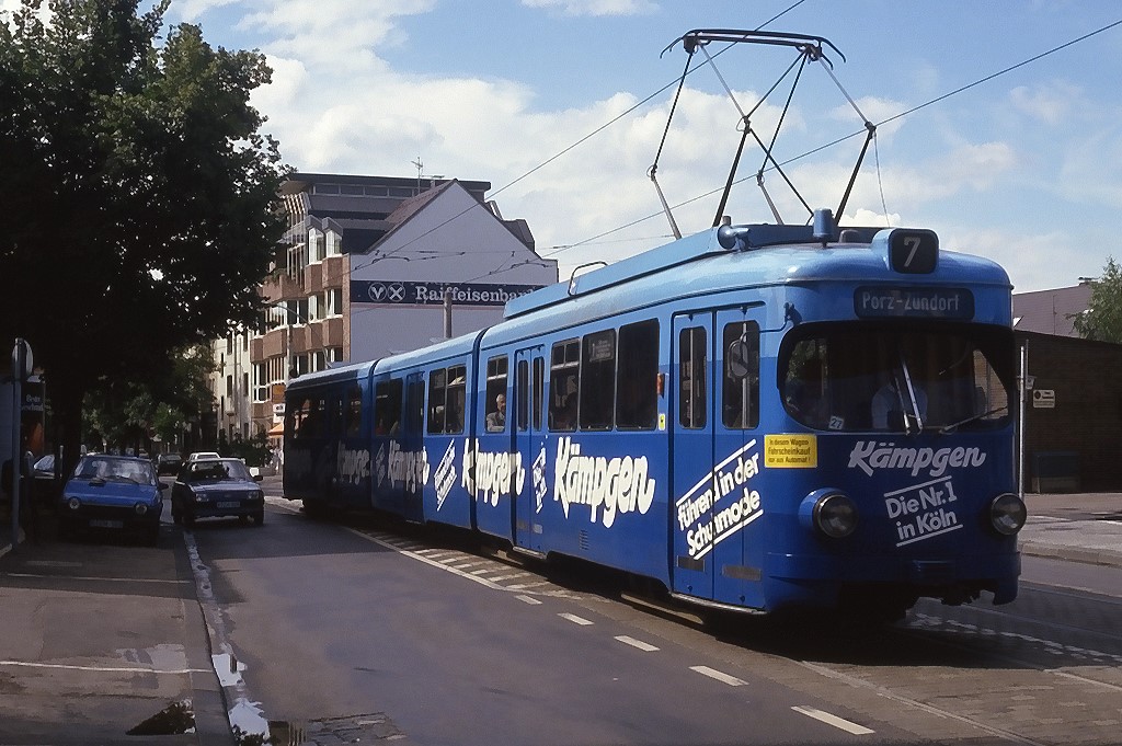 Köln 3702 in der Siegburger Straße auf der Linie 7 in Richtung Porz, 19.07.1987.