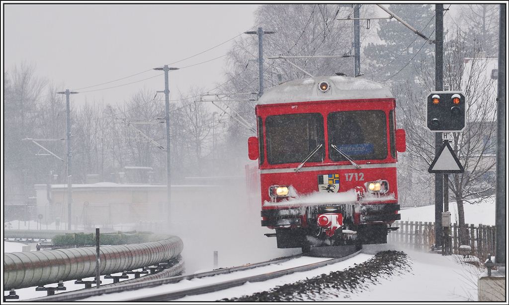 S1 1518 mit Steuerwagen 1712 im Schneegestöber bei Zizers Altlöser. (12.02.2013)