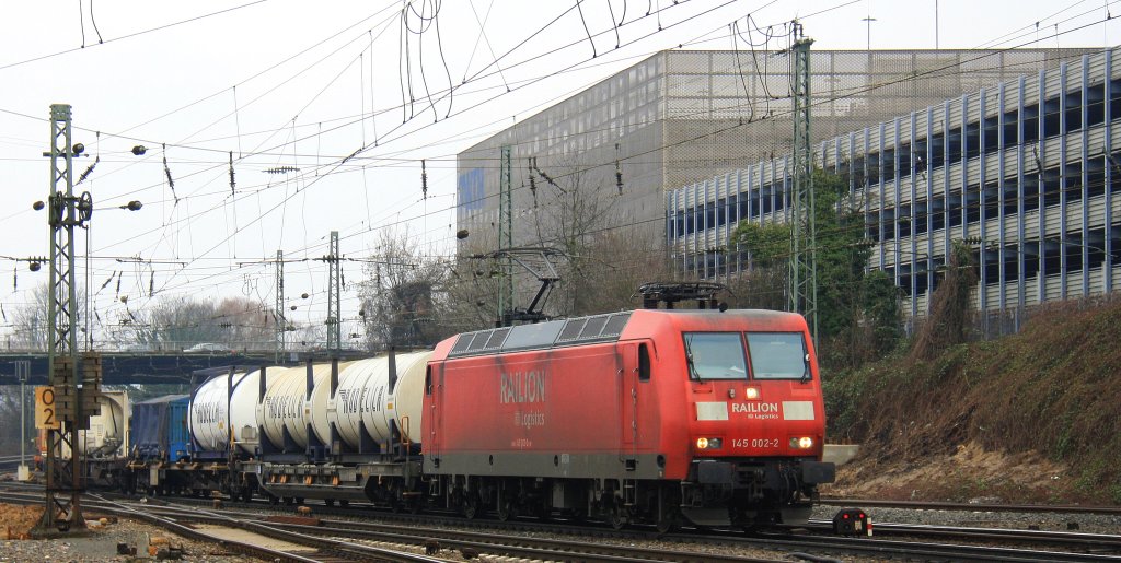 145 002-2 von Railion kommt aus Richtung Köln mit einem Containerzug aus Gallarate(B) nach Zeebrugge(B) und fährt in Aachen-West ein bei Wolken am 16.2.2013.