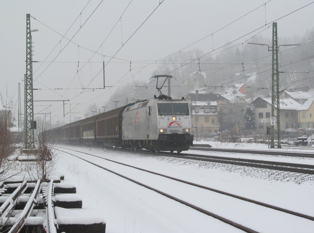 185 539-4 der TX Logistik zieht am 16. Februar 2013 einen H-Wagenzug durch Kronach.