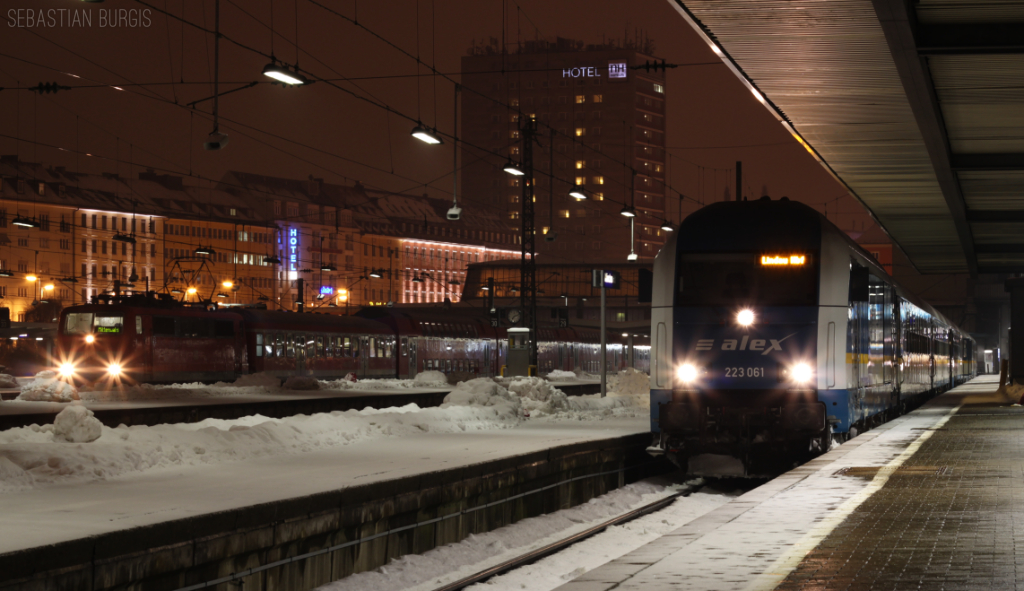 Abendszene aus München Hbf: Während der Alex, geführt von 223 061, in Kürze um 19:19 seine Fahrt nach Lindau antreten wird, wartet im Hintergrund noch eine 111 mit ihrer Regionalbahn nach Mittenwald, welche erst um 19:32 abfahren wird (15.02.2013)