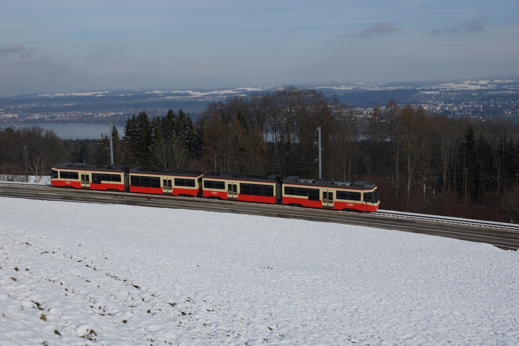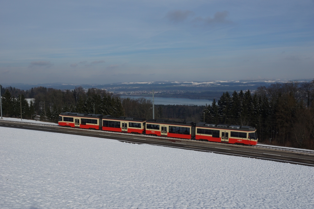 Be 4/6 67 und Be 4/6 66 fahren am 12.01.2013 von Forch Richtung Esslingen, aufgenommen unterhalb von Scheuren.