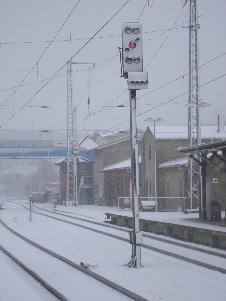 Den ganzen 06.Februar 2013 sahen die Ausfahrsignale "M" und "L"(im Hindergrund) in Bergen/Rügen durch den heftigen Schneefall so aus.